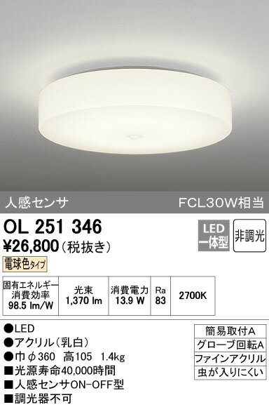 電球色光束:1370lm消費電力:13.9WRa832700Kアクリル(乳白)巾φ360・高105・1.4kg人感センサON-OFF型調光器不可簡易取付Aグローブ回転Aファインアクリル虫が入りにくい検索用カテゴリ3【電気工事不要】 【センサー付】 【LED照明】 【電球色】 【非調光】