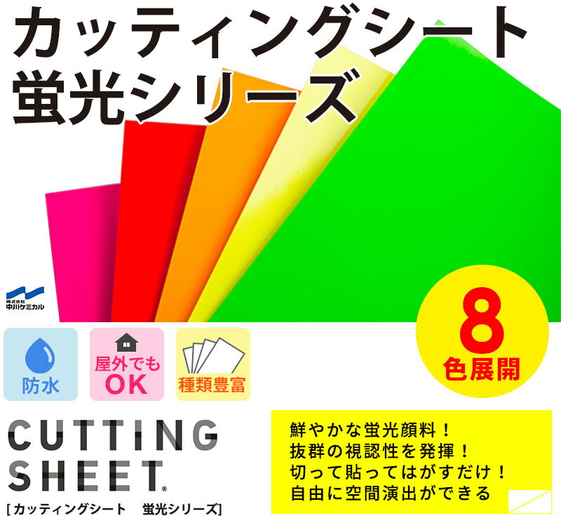 商品名 カッティングシート 蛍光 8色 寸法 45cm x 10m巻 素材 アクリル系樹脂+塩化ビニル系樹脂 粘着剤 アクリル系強粘着 耐候性 屋外3ヶ月〜1年 ※耐候性はあくまで参考値であり、保証値ではございません。